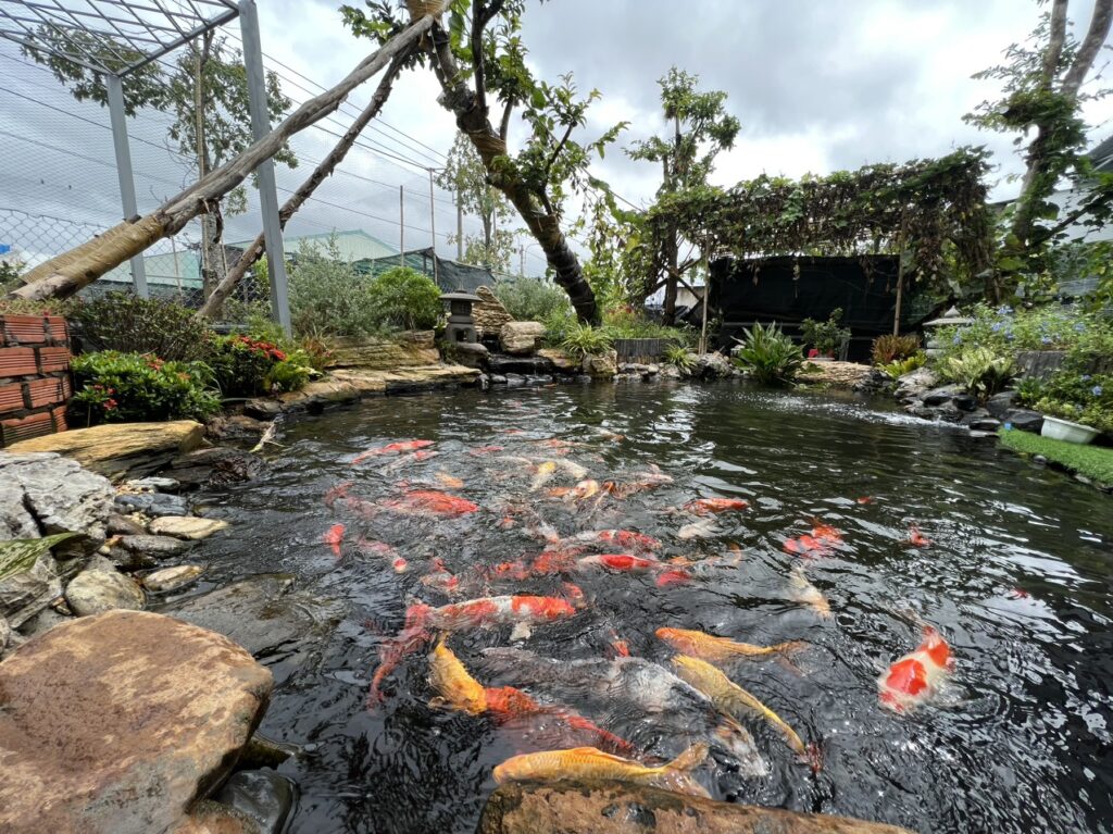 Hồ cá koi sân vườn đang trở thành xu hướng thiết kế cảnh quan cao cấp cho biệt thự, nhà vườn và quán cà phê sân vườn. Một hồ koi đẹp thường kết hợp giữa nước – đá – cây xanh – cá koi, tạo nên không gian thư giãn và gần gũi thiên nhiên.